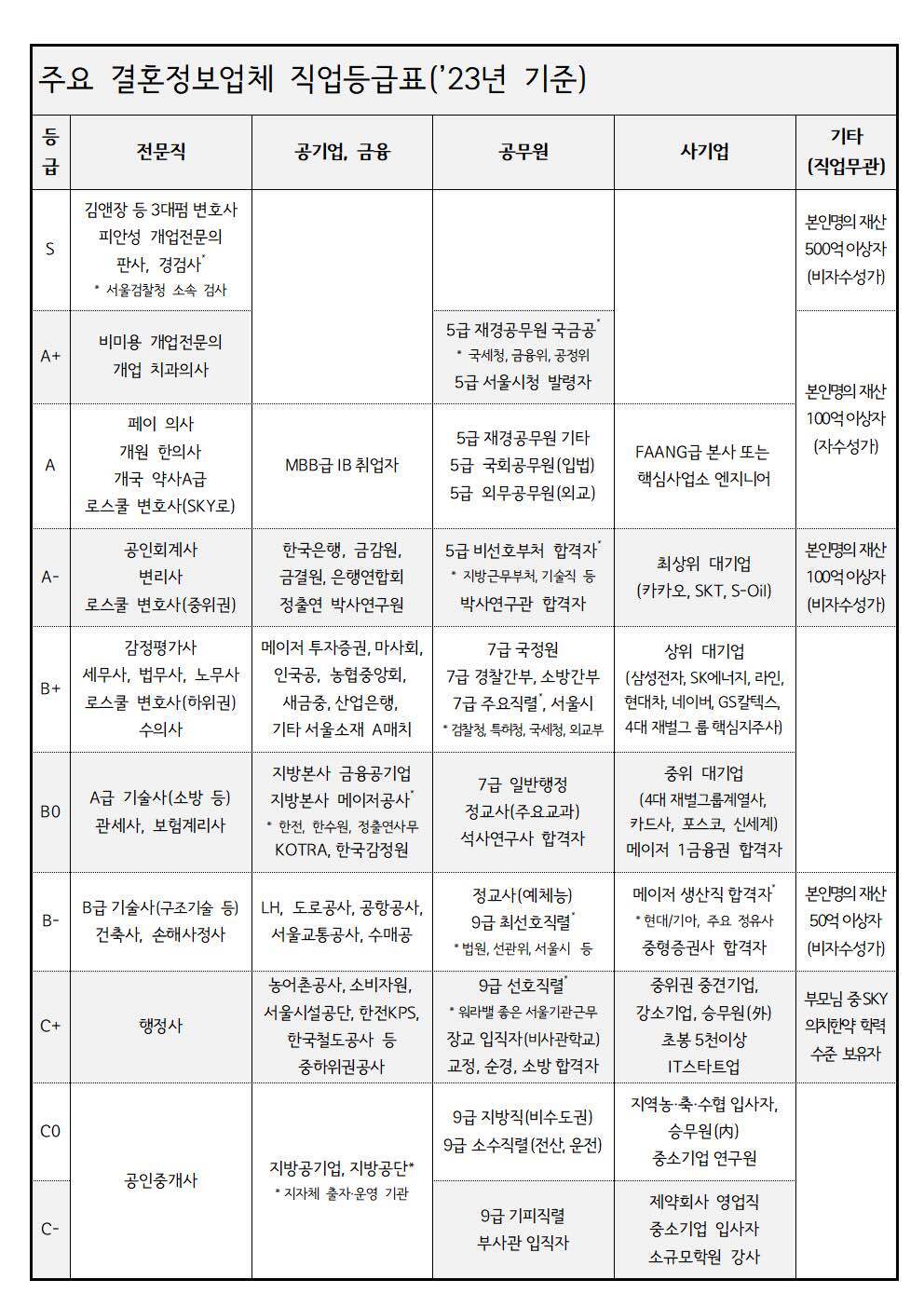 커뮤니티에서 떠도는 주요 결혼정보업체의 직업등급표는 아래와 같습니다.